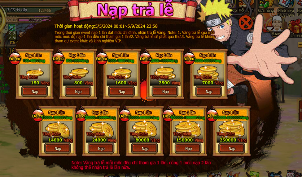 Trong thời gian event nạp 1 lần đạt mức chỉ định , nhận trả lễ vàng