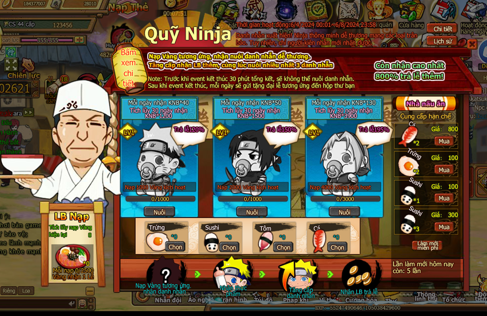 1. Người chơi nạp vàng , kích hoạt quỹ ninja : kích hoạt naruto cần nạp 2500 vàng , kích hoạt sasuke cần nạp 5000 vàng , kích hoạt sakura cần nạp 10000 vàng