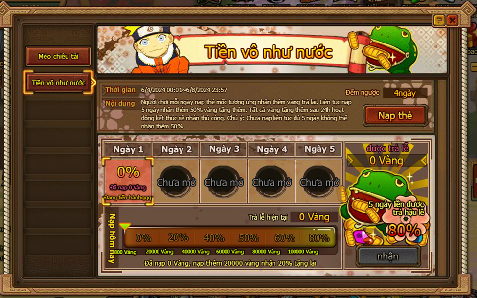 1. Người chơi mỗi ngày nạp thẻ mốc tương ứng nhận thêm vàng trả lại. Liên tục nạp 5 ngày nhận thêm 80% vàng tặng thêm. Tất cả vàng tặng thêm sau 24h hoạt động kết thúc sẽ nhận thủ công. Chú ý: Chưa nạp liên tục đủ 5 ngày không thể nhận thêm 80%.