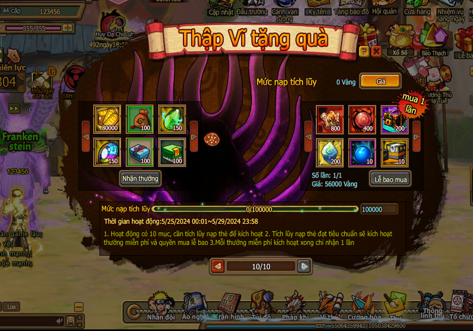 1. Hoạt động có 10 mục, cần tích lũy nạp thẻ để kích hoạt.