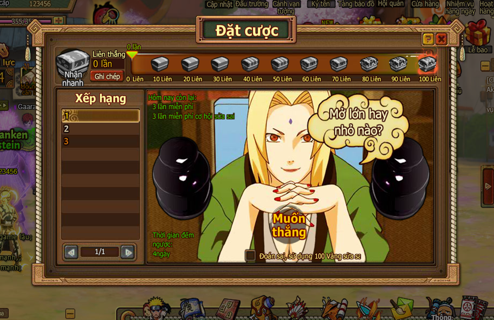 2. Thi đấu bắt đầu khi người chơi điểm số mình lớn hơn hay nhở hơn điểm của Tsunade, nhấn vào nút Lớn hoặc Nhỏ.