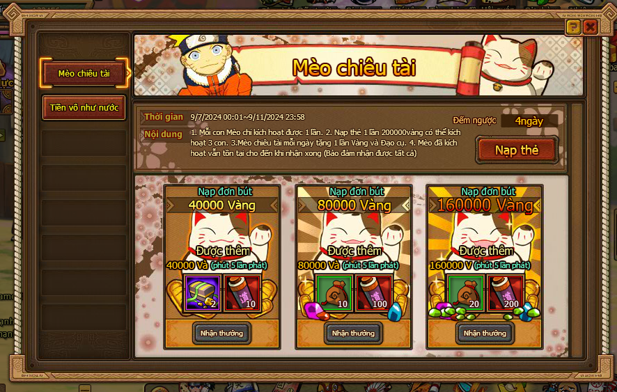 3. Mèo chiêu tài mỗi ngày tặng 1 lần Vàng và đạo cụ.