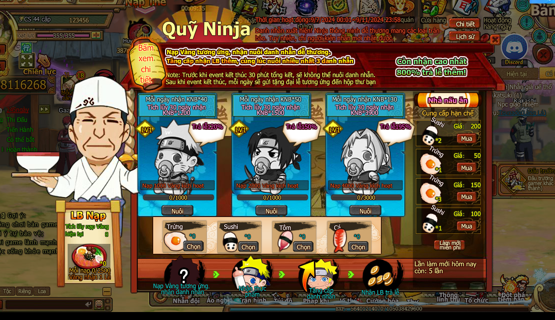 1. Người chơi nạp vàng , kích hoạt quỹ ninja : kích hoạt naruto cần nạp 1000 vàng , kích hoạt sasuke cần nạp 2000 vàng , kích hoạt sakura cần nạp 4000 vàng