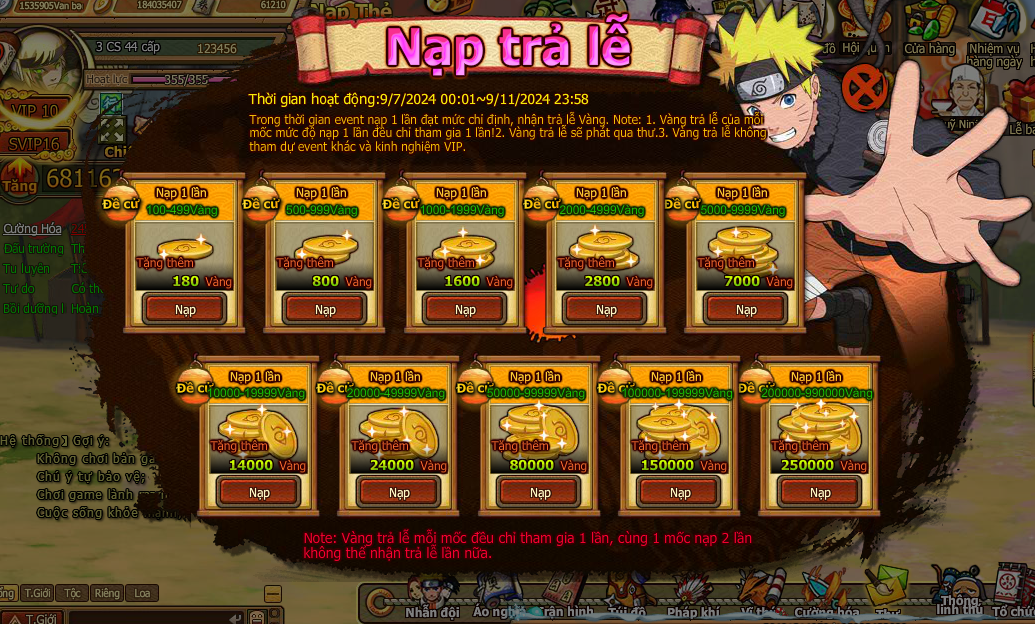 Trong thời gian event nạp 1 lần đạt mức chỉ định , nhận trả lễ vàng