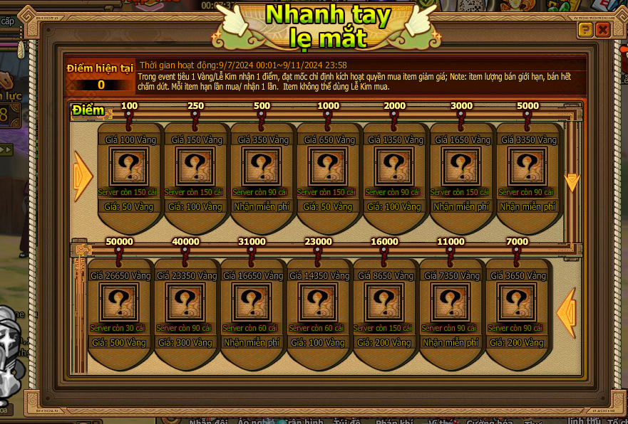 Trong event tiêu 1 vàng/ lễ kim nhận 1 điểm , đạt mốc chỉ định kích hoạt quyền mua item giảm giá
