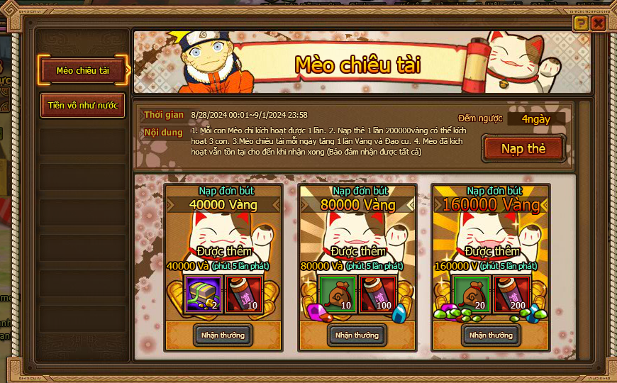 3. Mèo chiêu tài mỗi ngày tặng 1 lần Vàng và đạo cụ.