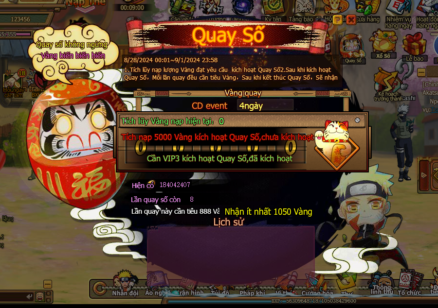 2. Sau khi kích hoạt Quay Số, Mỗi lần quay đều cần tiêu Vàng, sau khi kết thúc Quay Số, sẽ nhận Vàng trả