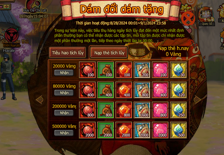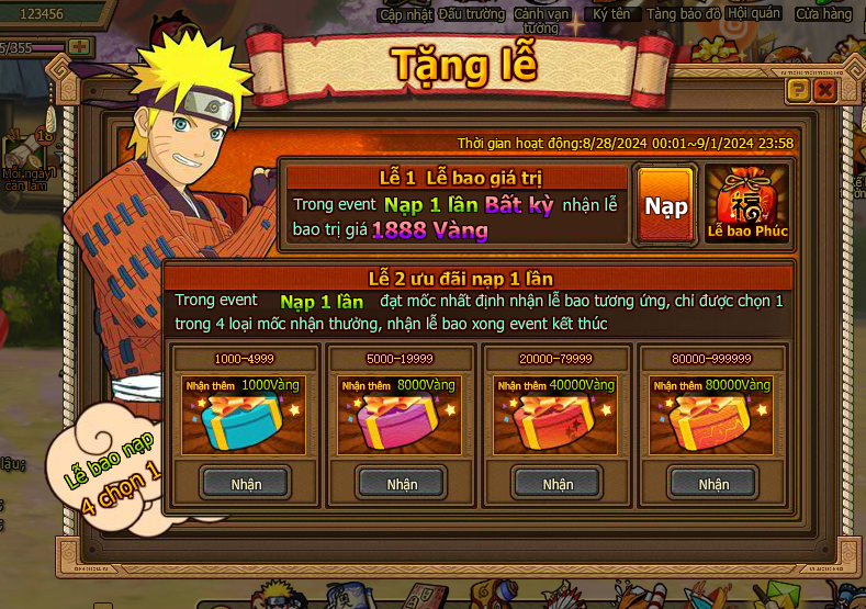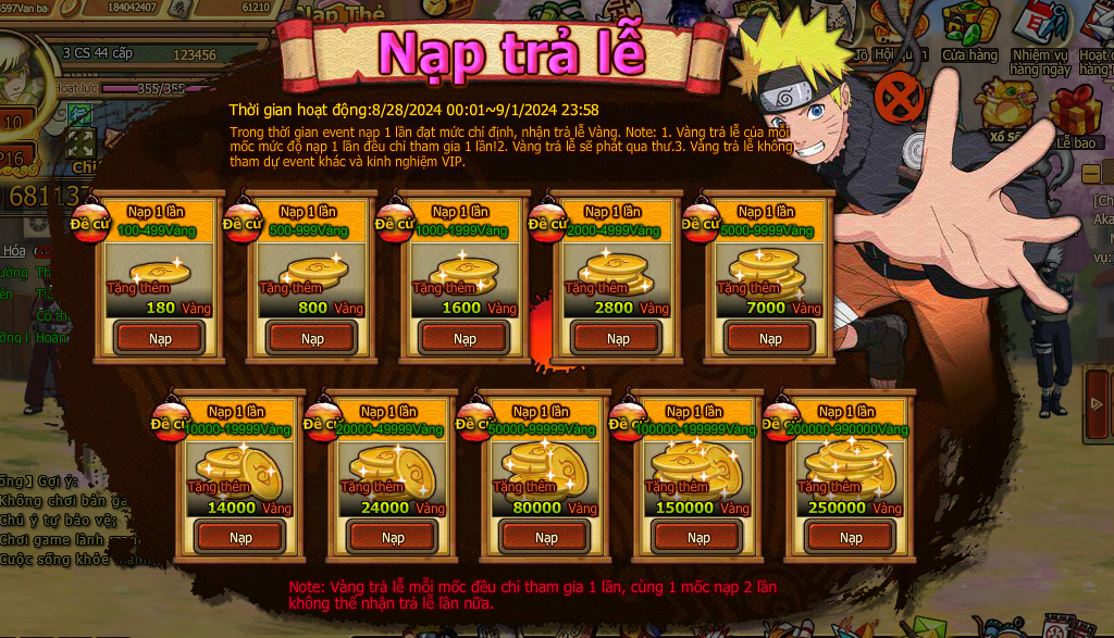 Trong thời gian event nạp 1 lần đạt mức chỉ định , nhận trả lễ vàng