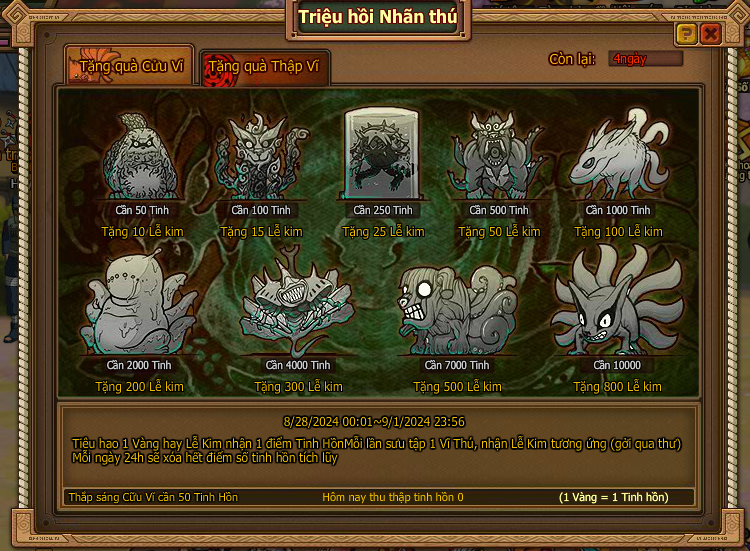 4. Tiêu hao 1 vàng/ lễ kim nhận tinh hồn , thu thập đủ điều kiện nhận rương quà qua thư