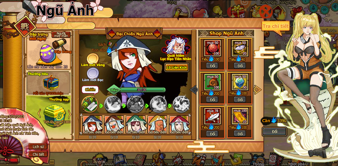 7. ở [Shop Ngũ Ảnh] tiêu [Tinh hồn] đổi các loại đạo cụ, và Ninja mới [Kurenai Kimono] đợi bạn chiêu mộ.