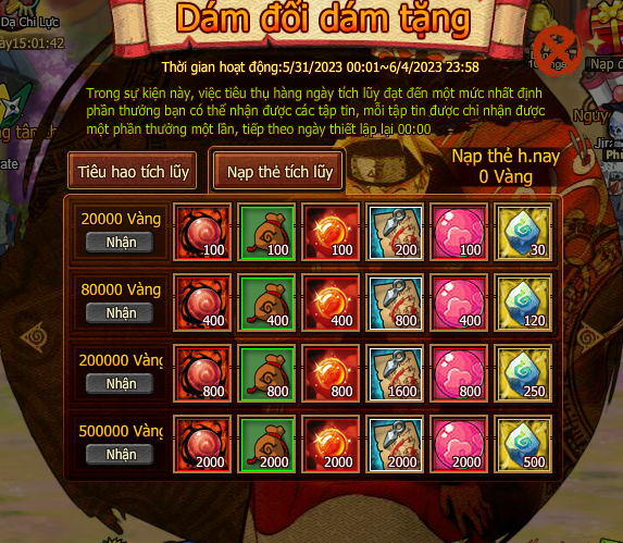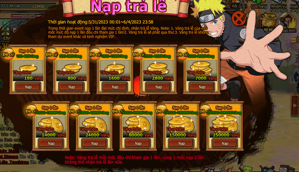 Vàng trả lễ của mỗi mốc mức độ nạp 1 lần đều chỉ tham gia 1 lần