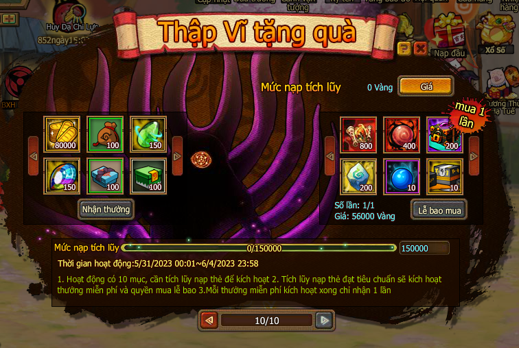 Trong thời gian event nạp 1 lần đạt mức chỉ định , nhận trả lễ vàng.