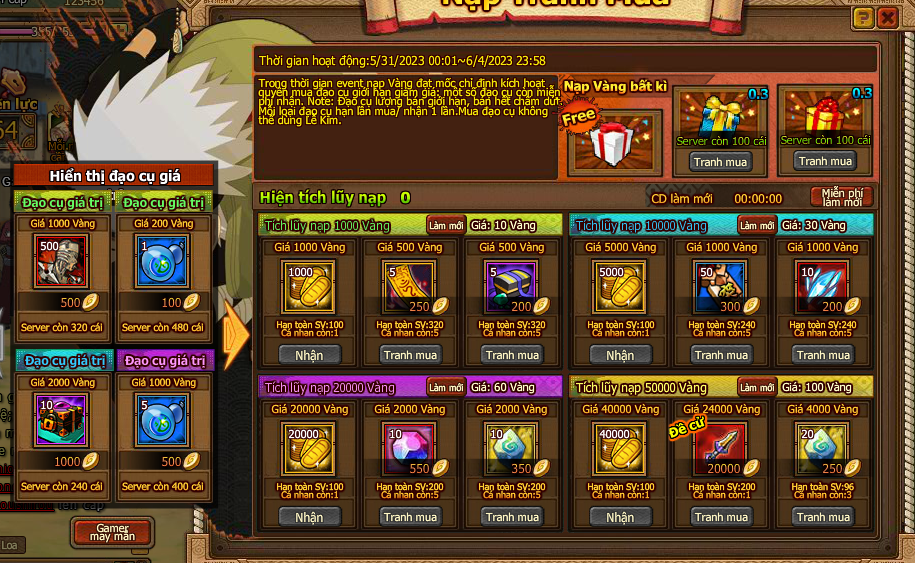 1. Trong thời gian event nạp Vàng đạt mốc chỉ định kích hoạt quyền mua đạo cụ giới hạn giảm giá: một số đạo cụ còn miễn phí nhận.