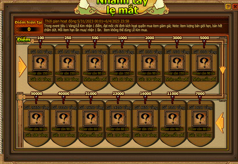 Note : Item lượng bán giới hạn , bán hết chấm dứt . Mỗi item hạn 1 lần mua / nhận. team ko thể dùng lễ kim mua