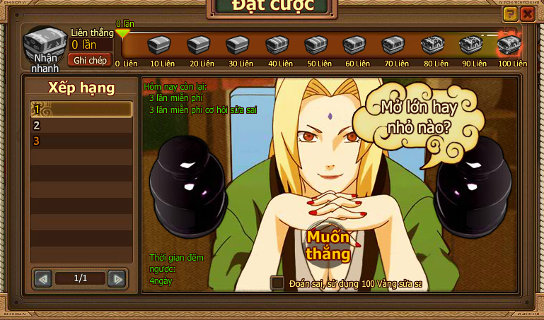 2. Thi đấu bắt đầu khi người chơi điểm số mình lớn hơn hay nhở hơn điểm của Tsunade, nhấn vào nút Lớn hoặc Nhỏ.