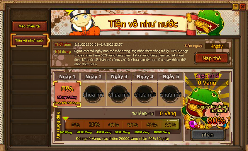 1. Người chơi mỗi ngày nạp thẻ mốc tương ứng nhận thêm vàng trả lại. Liên tục nạp 5 ngày nhận thêm 80% vàng tặng thêm. Tất cả vàng tặng thêm sau 24h hoạt động kết thúc sẽ nhận thủ công. Chú ý: Chưa nạp liên tục đủ 5 ngày không thể nhận thêm 80% .