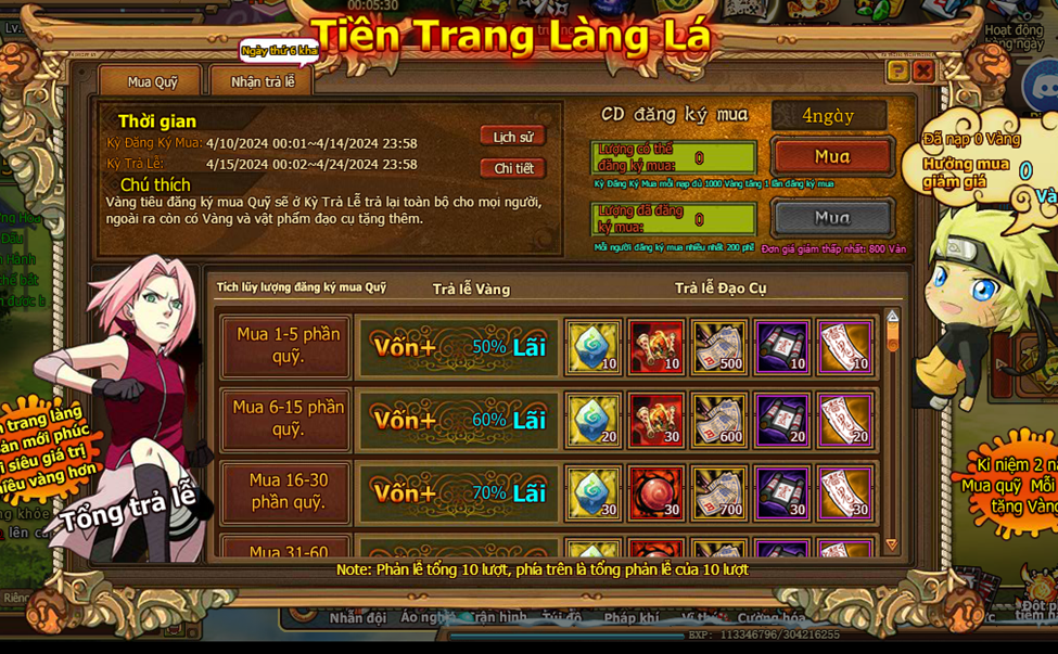 Người chơi căn cứ số phần mua Quỹ mỗi ngày nhận 1 lần Quỹ thưởng trả lễ , trả lễ bao gồm trả lễ vàng và đạo cụ