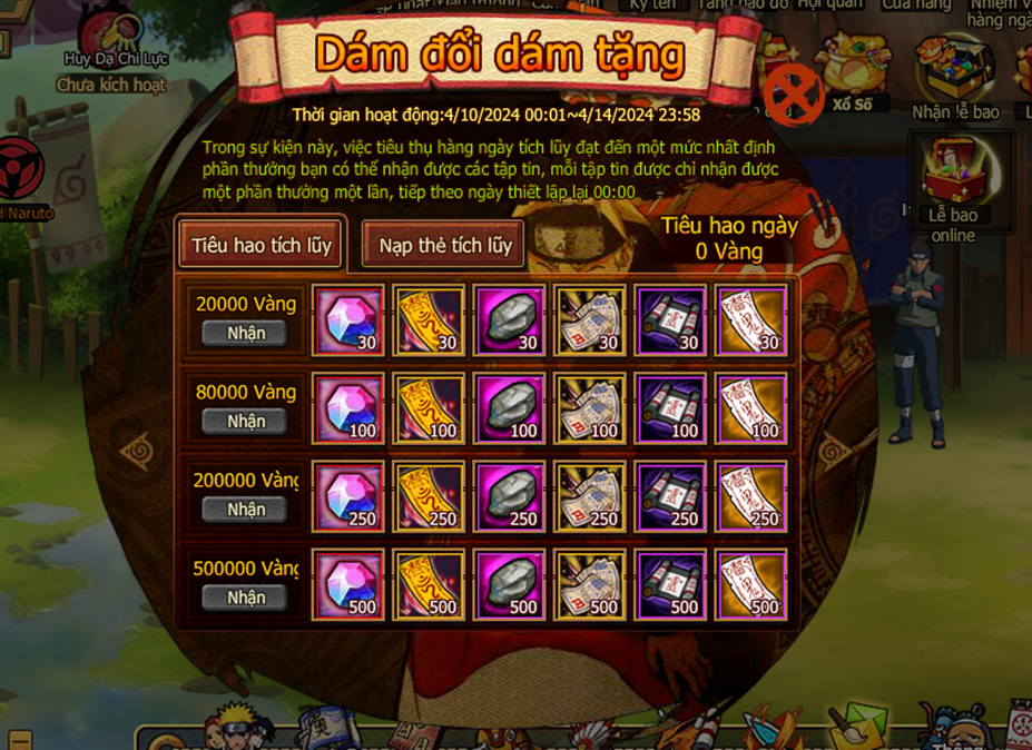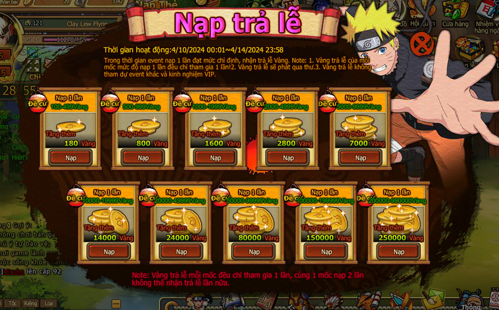 Trong thời gian event nạp 1 lần đạt mức chỉ định , nhận trả lễ vàng