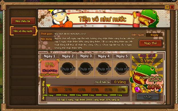 1. Người chơi mỗi ngày nạp thẻ mốc tương ứng nhận thêm vàng trả lại. Liên tục nạp 5 ngày nhận thêm 80% vàng tặng thêm. Tất cả vàng tặng thêm sau 24h hoạt động kết thúc sẽ nhận thủ công. Chú ý: Chưa nạp liên tục đủ 5 ngày không thể nhận thêm 80%.
