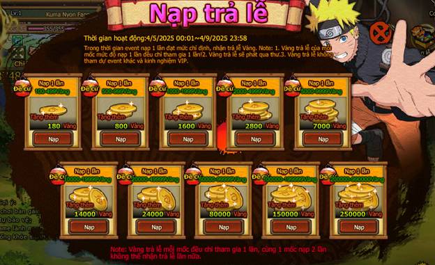 Trong thời gian event nạp 1 lần đạt mức chỉ định , nhận trả lễ vàng