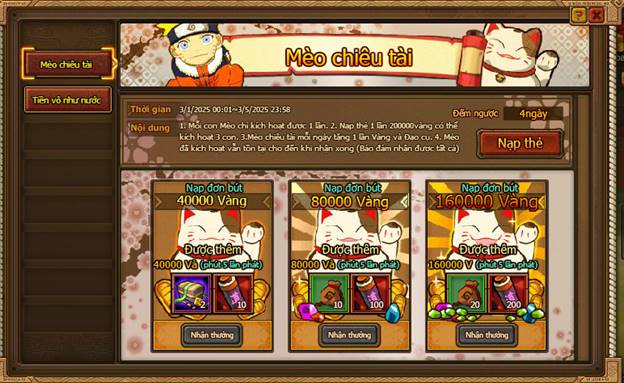3. Mèo chiêu tài mỗi ngày tặng 1 lần Vàng và đạo cụ.
