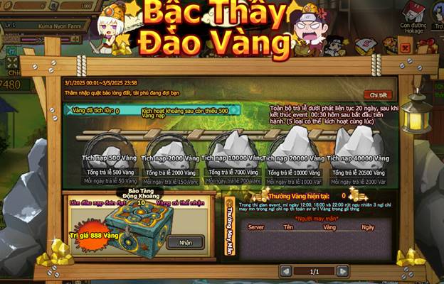 5. Trong thời gian event , nạp 1 lần đầu tiên thỏa nhận thêm bảo tàng khoáng . Trong thời gian , thống kê mức nạp của người chơi toan sv đến giải thưởng may mắn , Mổi nạp 1 Vàng giải thưởng tăng 1 Vàng , mỗi ngày 12:00, 18:00, 22:00 rút ngẫu nhiên 3 người chơi may mắn trong người chơi nạp thẻ toàn sv trả lễ Vàng