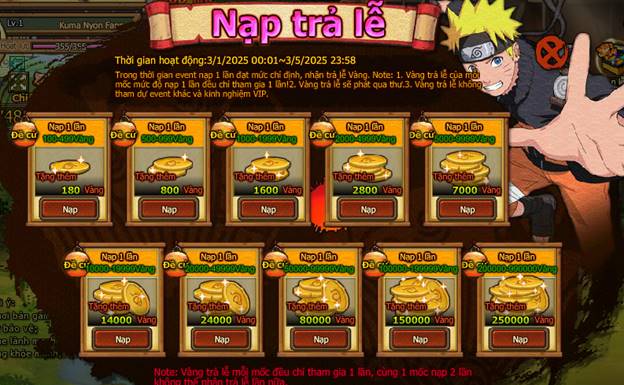 Trong thời gian event nạp 1 lần đạt mức chỉ định , nhận trả lễ vàng