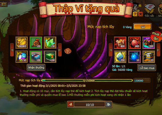 1. Hoạt động có 10 mục, cần tích lũy nạp thẻ để kích hoạt.