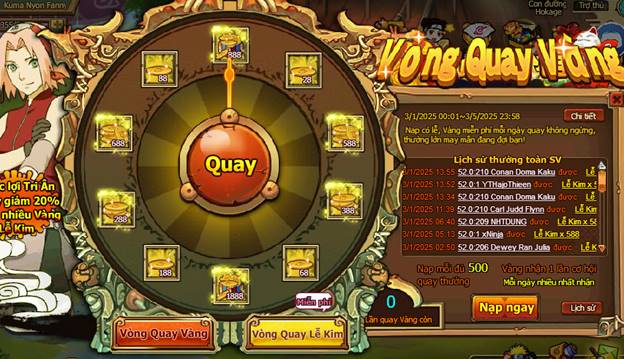 1. Trong thời gian event, người chơi nạp đủ 500 vàng nhận 1 lần cơ hội quay ( vòng quay vàng )