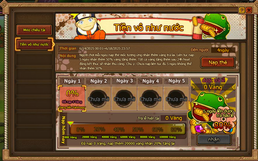 1. Người chơi mỗi ngày nạp thẻ mốc tương ứng nhận thêm vàng trả lại. Liên tục nạp 5 ngày nhận thêm 80% vàng tặng thêm. Tất cả vàng tặng thêm sau 24h hoạt động kết thúc sẽ nhận thủ công. Chú ý: Chưa nạp liên tục đủ 5 ngày không thể nhận thêm 80%.
