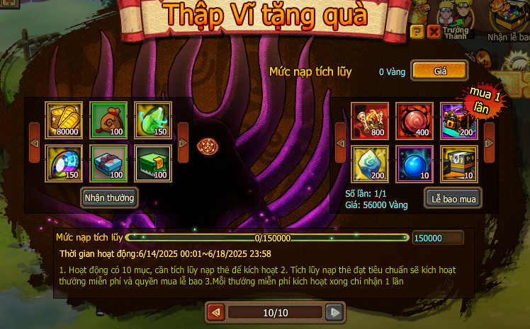Trong thời gian event nạp 1 lần đạt mức chỉ định , nhận trả lễ vàng