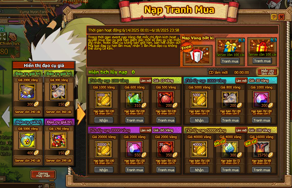 1. Trong thời gian event nạp Vàng đạt mốc chỉ định kích hoạt quyền mua đạo cụ giới hạn giảm giá: một số đạo cụ còn miễn phí nhận.