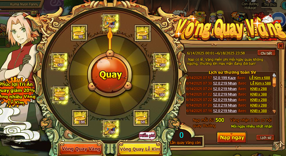 1. Trong thời gian event, người chơi nạp đủ 500 vàng nhận 1 lần cơ hội quay ( vòng quay vàng )