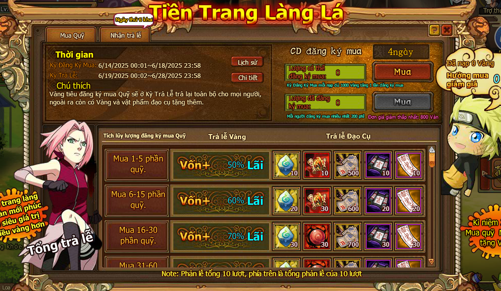 Người chơi căn cứ số phần mua Quỹ mỗi ngày nhận 1 lần Quỹ thưởng trả lễ , trả lễ bao gồm trả lễ vàng và đạo cụ