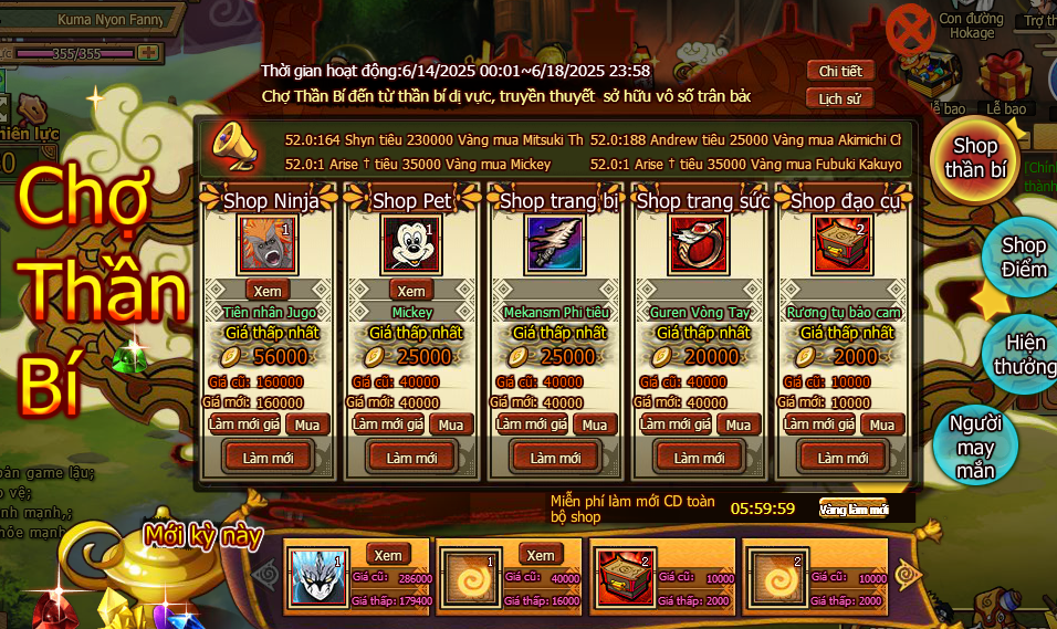 2. Trong chợ thần bí có 5 loại shop , phân biệt gồm shop ninja , shop pet , shop trang bị , shop trang sức và shop đạo cụ , mỗi shop đều bán loại vật phẩm tương ứng