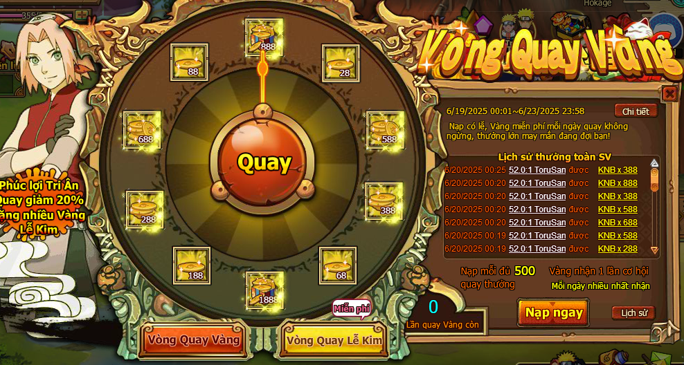 1. Trong thời gian event, người chơi nạp đủ 500 vàng nhận 1 lần cơ hội quay ( vòng quay vàng )