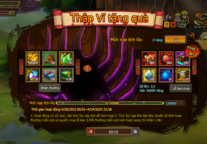 1. Hoạt động có 10 mục, cần tích lũy nạp thẻ để kích hoạt.