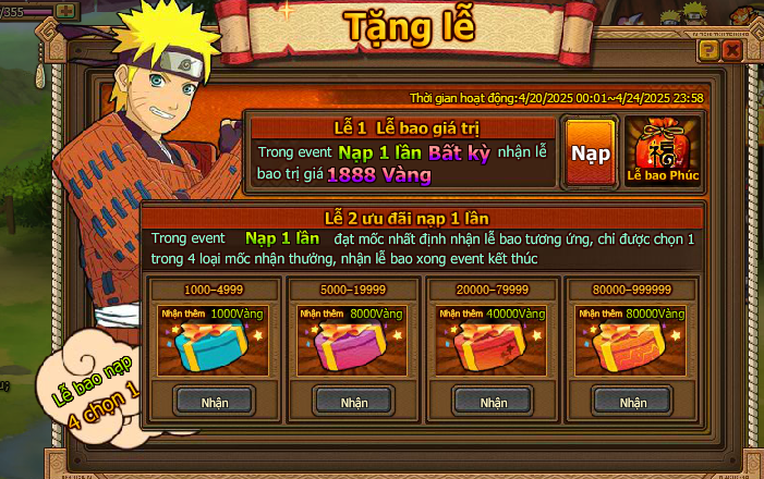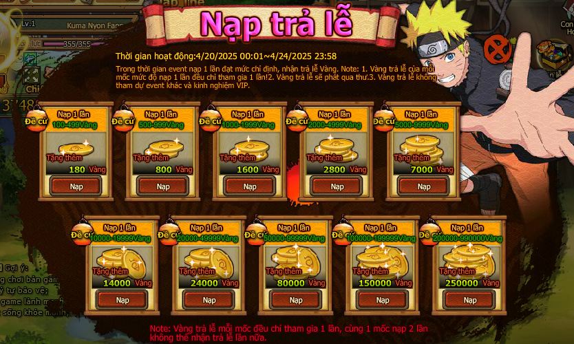 Trong thời gian event nạp 1 lần đạt mức chỉ định , nhận trả lễ vàng