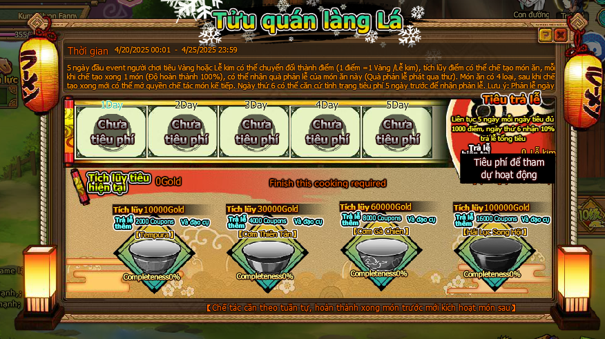 1. 5 ngày đầu event người chơi tiêu Vàng hoặc Lễ Kim có thể chuyển đổi thanh điểm ( 1 điểm = 1 vàng / lễ kim )