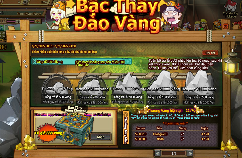 5. Trong thời gian event , nạp 1 lần đầu tiên thỏa nhận thêm bảo tàng khoáng . Trong thời gian , thống kê mức nạp của người chơi toan sv đến giải thưởng may mắn , Mổi nạp 1 Vàng giải thưởng tăng 1 Vàng , mỗi ngày 12:00, 18:00, 22:00 rút ngẫu nhiên 3 người chơi may mắn trong người chơi nạp thẻ toàn sv trả lễ Vàng