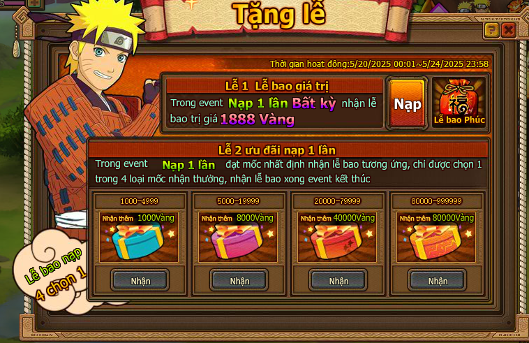 2. Nạp đơn 5000 Vàng kích hoạt điều kiện nhận Quà Đặc Biệt