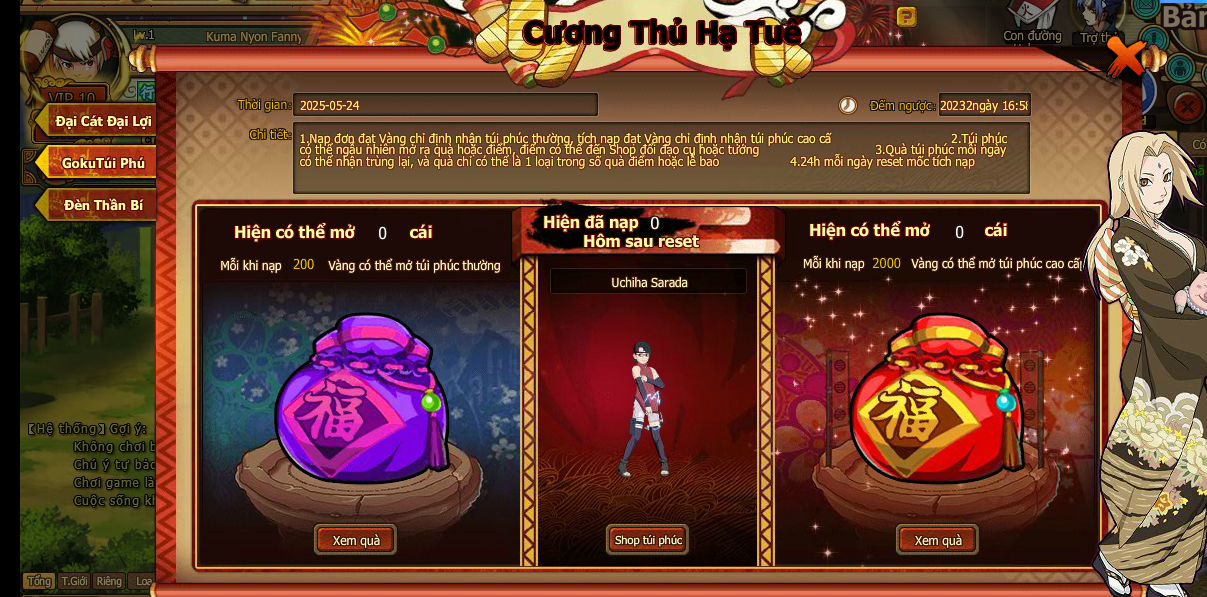 3. Quà túi phúc mỗi ngày có thể nhận trùng lại, và quà chỉ có thể là 1 loại trong số quà điểm hoặc lễ bao.