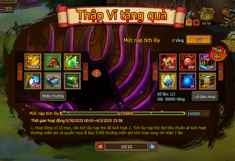 1. Hoạt động có 10 mục, cần tích lũy nạp thẻ để kích hoạt.