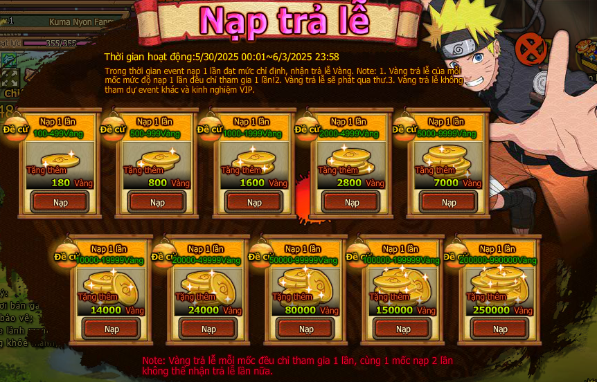 Trong thời gian event nạp 1 lần đạt mức chỉ định , nhận trả lễ vàng