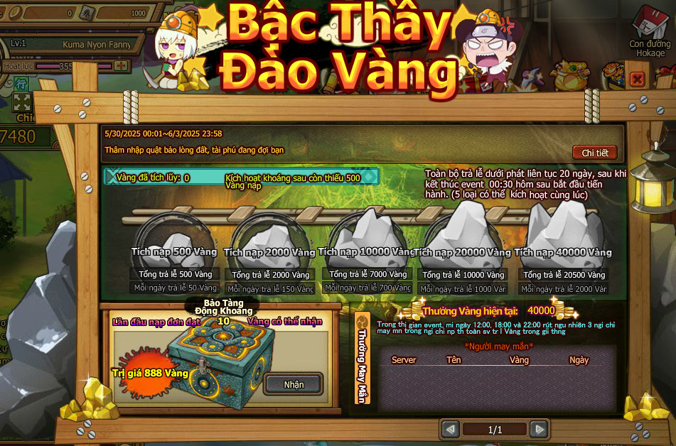 5. Trong thời gian event , nạp 1 lần đầu tiên thỏa nhận thêm bảo tàng khoáng . Trong thời gian , thống kê mức nạp của người chơi toan sv đến giải thưởng may mắn , Mổi nạp 1 Vàng giải thưởng tăng 1 Vàng , mỗi ngày 12:00, 18:00, 22:00 rút ngẫu nhiên 3 người chơi may mắn trong người chơi nạp thẻ toàn sv trả lễ Vàng