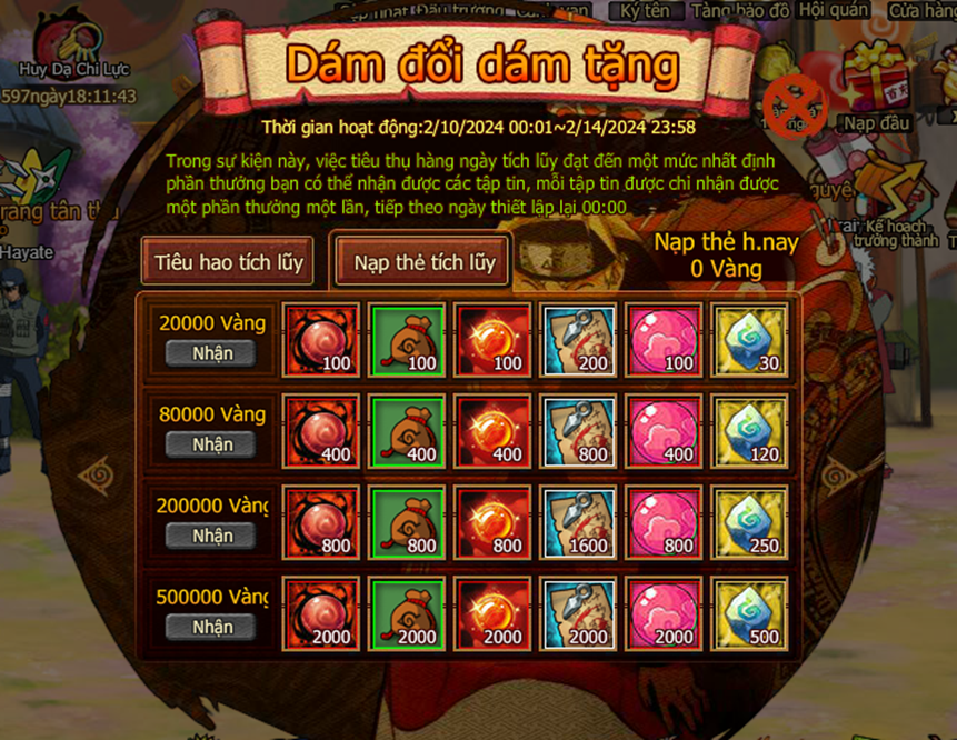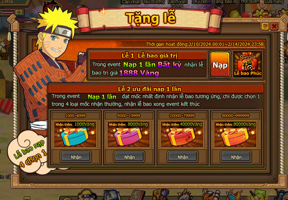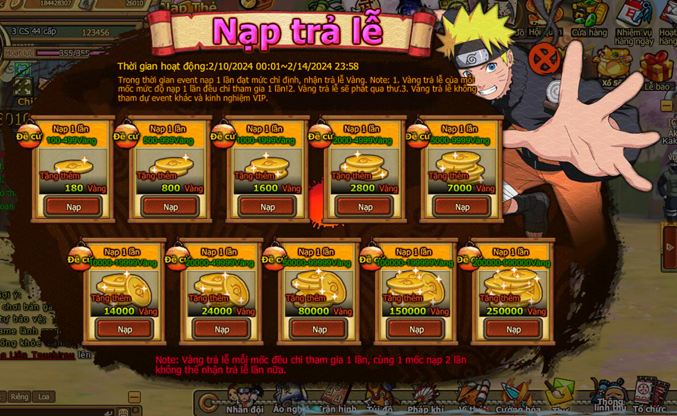 Trong thời gian event nạp 1 lần đạt mức chỉ định , nhận trả lễ vàng