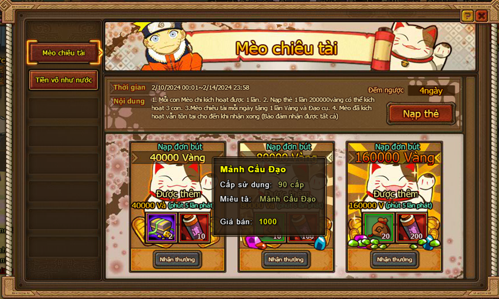 3. Mèo chiêu tài mỗi ngày tặng 1 lần Vàng và đạo cụ.