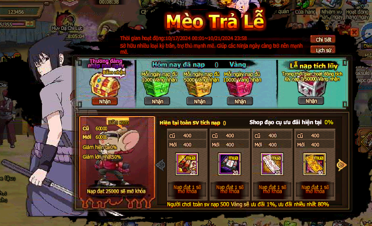 1. Trong thời gian event nạp Vàng đạt mốc chỉ định kích hoạt quyền mua đạo cụ giới hạn giảm giá: một số đạo cụ còn miễn phí nhận.