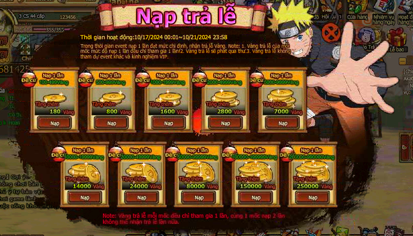 Trong thời gian event nạp 1 lần đạt mức chỉ định , nhận trả lễ vàng