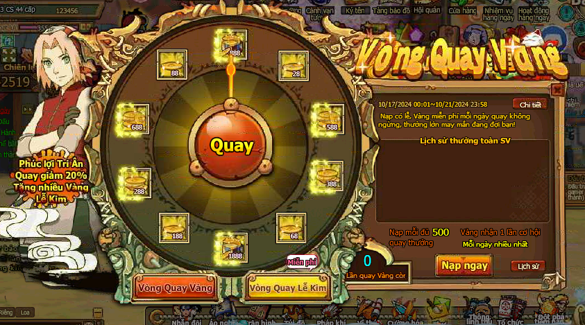 1. Trong thời gian event, người chơi nạp đủ 500 vàng nhận 1 lần cơ hội quay ( vòng quay vàng )